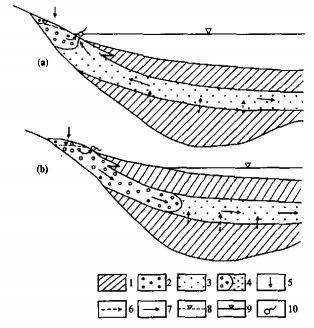 a.海岸上超时期压实水控制流场; b.海退时期入渗水控制流场.图右侧均存在区域排泄带.1.低渗透层(含压实释水层); 2.高渗透层(含入渗水); 3.高渗透层(含同生水及压实水); 4.不同类型水界线; 5.降水入渗; 6.压实释水; 7.地下水流向; 8.地下水位; 9.海水位; 10.泉