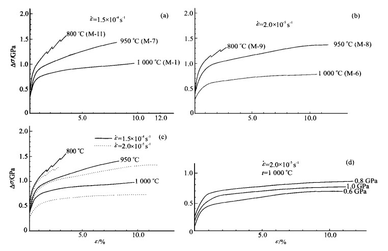 摘要: 以天然叶腊石为传压介质, 在温度800~100 0℃、围压0.6~1.0 GPa和应变速率10-4~10-5 s-1条件下, 对Maryland辉绿岩的脆性-塑性转化进行了实验研究.实验结果表明, 在10-4~10-5 s-1应变速率和固定围压1.0 GPa条件下, 当温度低于800℃时, 岩石变形为典型脆性破裂; 温度高于1000℃时岩石变形以准稳态蠕变为主; 温度在800~950℃之间, 岩石变形从脆性破裂向准塑性流动转化.温度变化对岩石脆-塑性转化影响敏感度高于压力变化对变形的敏感度.显微构造观察显示, 辉绿岩脆-塑性转化以稀疏弥漫状共轭塑性流动网络为特征.Abstract: A series of experiments on the transfer between the brittle and ductile properties of the Maryland diabase was performed, with natural pyrophyllite as the medium for the pressure transfer, at the temperature ranging from 800 to 1 000 ℃, at the confining pressure ranging from 0.6 GPa to 1.0 GPa, and at the strain rate ranging from 10-4 to 10-5 s-1. The experiment results show that the rock is deformed into typical brittle fractures at the strain rate ranging from 10-4 to 10-5 s-1, at the confining pressure of 1.0 GPa, and at the temperature lower than 800 ℃. At the temperature higher than 1 000 ℃, the rock is deformed dominantly into the metastable creep. At the temperature ranging from 800 to 950 ℃, the deformation of the rock turns from the brittle fractures to the pseudo ductile flow. Therefore, the sensitive effect of the temperature change on the rock transfer between brittle and ductile properties is greater than that of the pressure change. The micro structural observation shows that the transfer between the brittle and ductile properties in the diabase is dominated by the conjugated ductile flow network in the form of the rarefaction and diffusion.