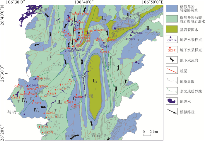 夹碎屑岩0.58 0.708 2 0.0 55.0 45.0 GZ001 1.02 0.708 1 0.0 52.0 48.0 GZ047 1.59 0.708 0 0.0 46.0 54.0 GZ044 0.30 0.708 1 0.0 50.0 50.0 GZ043 0.59 0.710 6 22.0 53.0 25.0 GZ052 0.78 0.708 1 0.0 59.0 41.0 GZ055 碎屑岩 0.05 0.710 7 26.0 74.0 0.0 GZ005 地表水 0.63 0.708 0 0.0 72.0 28.0 GZ108 0.49 0.710 3 21.0 65.0 14.0 表 3 模拟地下水流路径的水样分析统计(mg/L)