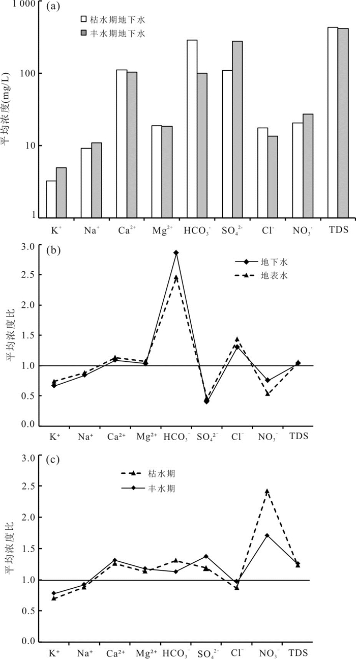 图 2 枯水期和丰水期地下水中各组分的平均浓度(a)、枯水期与丰水期不同溶质平均浓度比(b)以及地下水与地表水中不同溶质平均浓度比(c)
