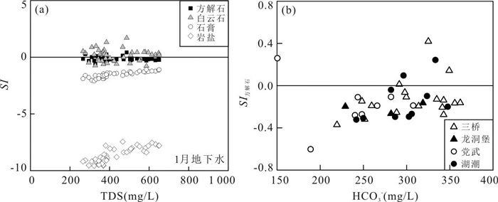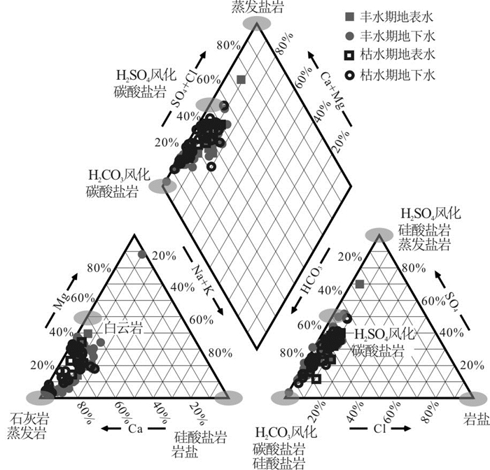 摘要: 岩溶地下水的水化学特征及其水岩作用过程研究对岩溶地下水合理开发利用和污染防治具有重要意义.综合利用水化学分析、主要离子比值、锶含量和87Sr/86Sr比值分析和反向水文地球化学模拟,深入分析了贵阳市地下水和地表水不同季节的水化学特征变化和水文地球化学演化过程.水化学特征分析表明,贵阳市地下水以HCO3·SO4-Ca型和HCO3-Ca·Mg型为主,水化学组成在季节和空间分布上存在一定的规律性变化,地表水与地下水的直接混合对地下水化学组成有一定的影响.锶同位素比值和水文地球化学反向模拟表明,地下水水化学组分主要受岩石风化作用的控制,以方解石和白云石为主的碳酸盐的溶解-沉淀作用以及硫酸盐和岩盐的溶解是控制研究区地下水水化学特征的重要过程,并受上覆孔隙含水层硅酸盐矿物水解的影响.Abstract: Study on hydrochemical characteristics and water-rock interaction is of great significance to ascertain the causes of groundwater pollution and the sustainable use of karst water. Hydrochemical components and types, ion ratios, strontium content, 87Sr/86Sr ratio and inverse hydrogeochemical modelling were employed to identify hydrochemical evolutional processes of karst groundwater in Guiyang City. The results show that the hydrochemical types of groundwater are mainly HCO3·SO4-Ca and HCO3-Ca·Mg, and the hydrochemical compositions of groundwater varied with time and space due to the dissolution/precipitation of different minerals. The mixing of surface water and groundwater has a certain influence on the hydrochemical characteristics of groundwater. Strontium isotope analysis and inverse hydrogeochemical modeling indicate that the hydrochemical characteristics of groundwater are mainly controlled by rock weathering. The dissolution-precipitation of carbonate dominated by calcite and dolomite as well as the dissolution of sulfate and halite are important processes to control the hydrochemical characteristics of groundwater in the study area, and are also affected by the hydrolysis of silicate minerals in the overlying porous aquifer.