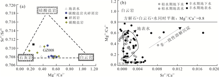 样品 类型 Sr2+(mg/L) 87Sr /86Sr 不同来源贡献率(%) 硅酸盐岩 石灰岩 白云岩 GZ075 碳酸盐岩 1.00 0.707 8 0.0 50.0 50.0 GZ004 0.55 0.708 2 0.0 48.0 52.0 GZ046 0.34 0.708 1 0.0 44.0 56.0 GZ021 0.94 0.707 7 2.0 98.0 0.0 GZ015 0.44 0.709 2 14.0 86.0 0.0 GZ054 0.34 0.708 9 9.0 74.0 17.0 GZ053 0.52 0.708 0 3.0 92.0 5.0 GZ008 0.80 0.710 3 19.0 60.0 21.0 GZ003 碳酸盐岩