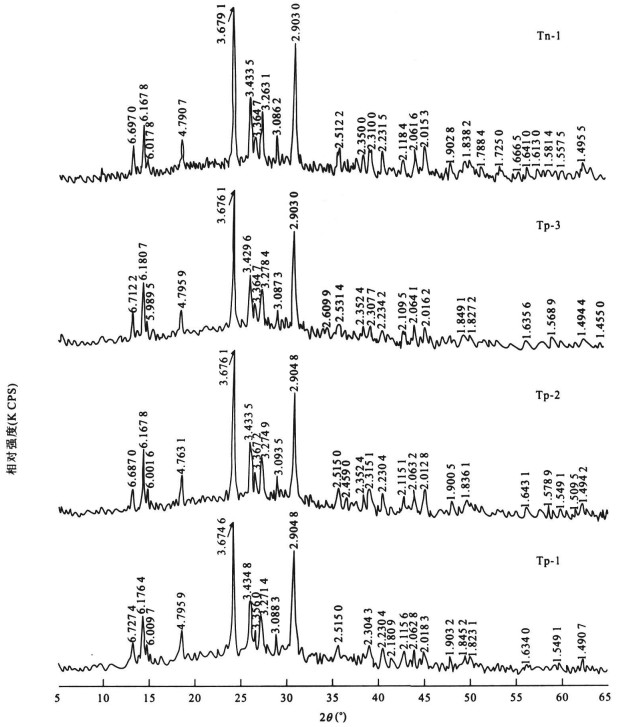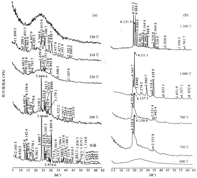 摘要: 绿松石的热性能分析在对其水的结构特征、呈色机理等的研究中具有重要指示作用.采用热重-差热分析(TG-DSC)、红外光谱(IR)和X-射线粉晶衍射(XRD) 分析方法, 对安徽马鞍山具磷灰石假象绿松石的热性能特征进行了研究.研究结果显示从室温到1100℃, 假象绿松石的热相变可划分为6个变化阶段: 100~200℃时, 为吸附水脱水阶段; 250~330℃, 假象绿松石中羟基和晶格水分子脱失; 330~750℃为非晶态物相阶段; 约750℃时为新物相形成阶段; 750~1100℃为具磷石英结构磷酸铝的形成阶段; 1100℃时磷酸铝的结晶有序度增加.假象绿松石结构及水的存在形式、总量和结合方式制约和影响着颜色的变化.Abstract: The study of the apatite pseudomorphic turquoise's thermal property plays a significant role in the investigation of the coloring mechanism and the structural characteristics of water in turquoise.In this paper, thermal property of the apatite pseudomorphic turquoise from Maanshan, Anhui Province, has been studied by using the thermogravimetric and thermal analysis (TG-DSC), infrared (IR) spectrum and X-ray powder (XRD) diffraction.From room temperature to 1 100 ℃, its thermal phase transformation can be divided into six stages: 100-200 ℃, the removal of the absorption water; 250-330 ℃, the release of the hydroxyl and lattice water; 330-750 ℃, the formation of non-crystalline structure; about 750 ℃, a new phase formed; 750-1 100 ℃, the generation of aluminum phosphate with tridymite structure, and 1 100 ℃, the degree of crystalline order of aluminum phosphate is improved.The color of pseudomorphic turquoise is controlled by the structure, the existence form and total amount of water, together with the binding mode of water molecules.
