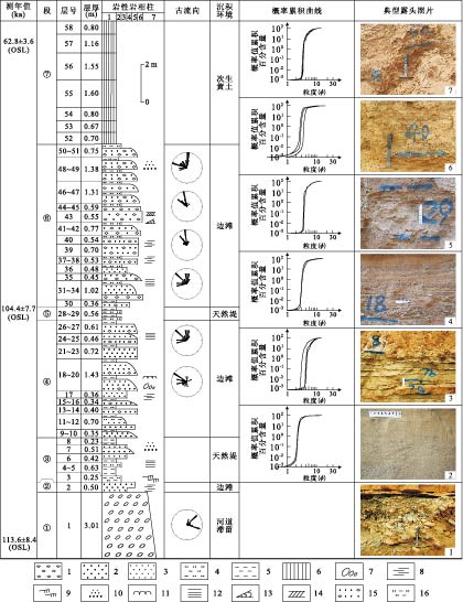 岩性岩相柱中:1.泥,2.粉砂,3.细砂,4.中砂,5.粗砂,6.细砾,7.巨砾;典型露头照片:1.Ⅲ级阶地⑦层河床滞留沉积,砾石具叠瓦状构造;2.Ⅲ级阶地⑥层曲流沙坝沉积,发育波状交错层理;3.Ⅲ级阶地⑤层天然堤沉积,砂泥互层,发育水平层理;4.Ⅲ级阶地④层曲流沙坝沉积,多个正粒序旋回组成,发育平行层理、泥裂;5.Ⅲ级阶地③层天然堤沉积,砂泥互层;6.Ⅲ级阶地②层曲流沙坝沉积,正粒序旋回组成,砾石含量较多,砾石具叠瓦状构造,发育水平层理;7.Ⅲ级阶地①层次生黄土沉积,块状;图例:1.砾岩,2.粗砂岩,3.细砂岩,4.粉砂岩,5.泥岩,6.黄土,7.叠瓦状构造,8.平行层理,9.爬升层理,10.正粒序层理,11.泥裂,12.水平层理,13.楔状交错层理,14.板状交错层理,15.含砾砂岩,16.泥质粉砂