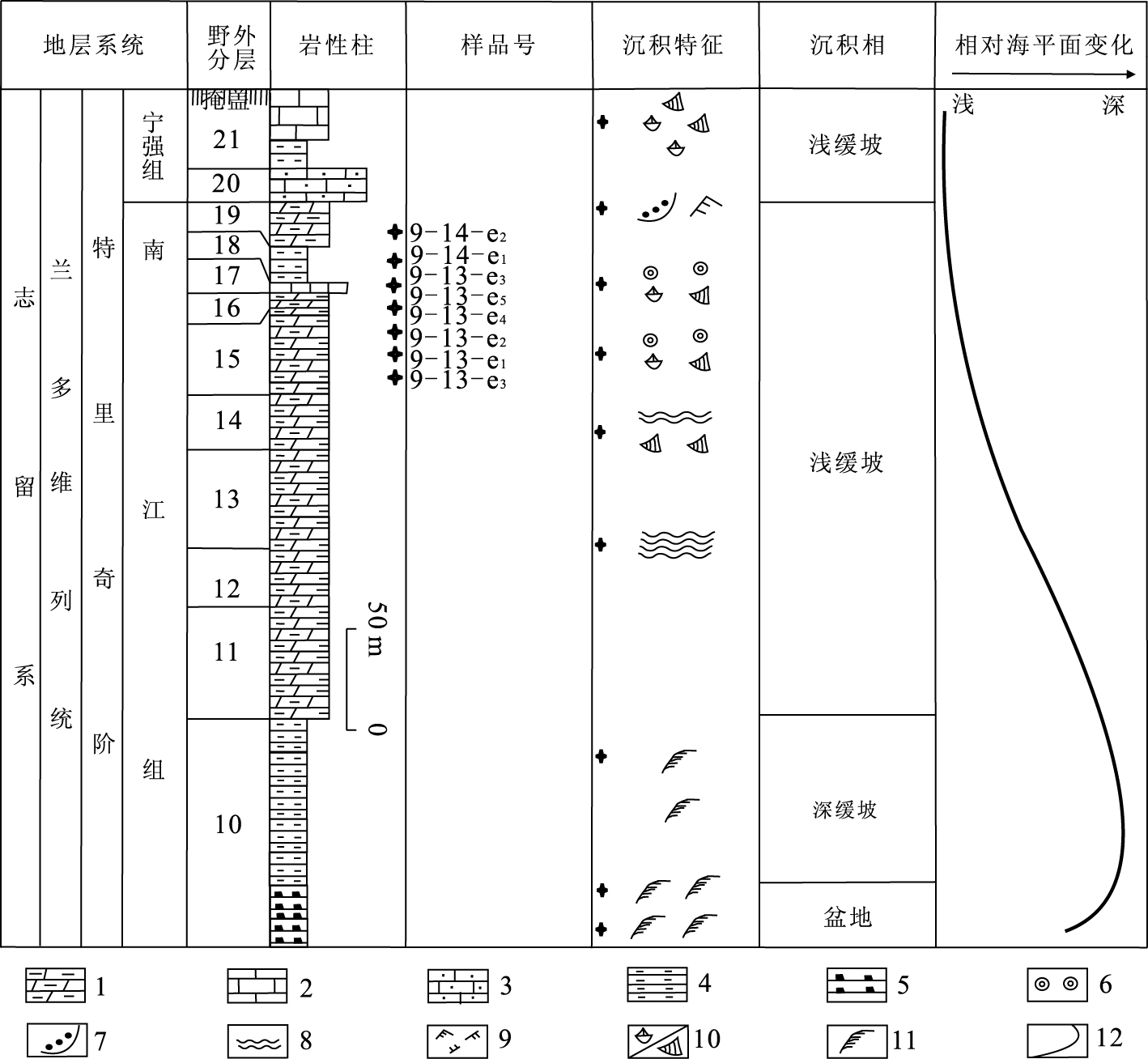 图 1 研究区早志留世晚期古地理背景及剖面位置(据陈旭和戎嘉余,1996;王鸿祯等,2006;Su et al., 2009) Fig. 1. Sketch map of paleogeographical setting of the Late Early Silurian interval and the location of studied section 表 1 研究地区鲕粒灰岩C、O同位素组成及Z值和古温度 Table 1. δ18O, δ13C, and Z values and paleotemperature of oolitic limestones in studied area 样号 δ13C(PDB, ‰) 修正后δ13C(PDB, ‰) δ18O(PDB, ‰) 修正后δ18O(PDB, ‰) δ18O(SMOW, ‰) 古温度(t, ℃) Z值 9-13-e1 -1.68 -0.80 -10.31 -4.77 20.23 25.92 123.29 9-13-e2 -1.68 -0.80 -11.50 -5.96 19.01 31.74 122.69 9-13-e3 -0.14 0.74 -10.19 -4.65 20.35 25.35 126.50 9-13-e4 -0.52 0.36 -10.57 -5.03 19.97 27.16 125.53 9-13-e5 -2.20 -1.32 -11.27 -5.73 19.24 30.59 121.74 9-14-e1 -0.55 0.33 -11.26 -5.72 19.25 30.54 125.13 9-14-e2 -1.72 -0.84 -12.62 -7.08 17.85 37.48 122.05 注:样品处理及同位素测试由中国地质大学(北京)地学实验中心稳定同位素实验室完成.
