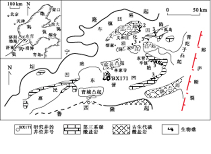 图 2 济阳坳陷第三纪湖相生物礁分布(据杜韫华,1996修改)