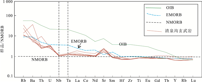 图 6 清泉沟玄武岩微量元素NMORB标准化蛛网图解
