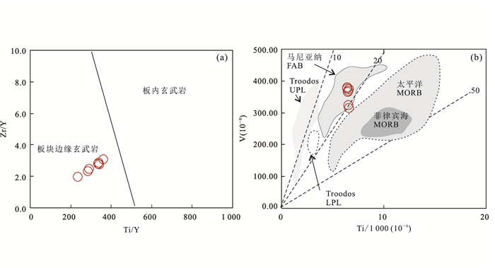图 7 清泉沟玄武岩Ti/Y-Zr/Y图解(a)和Ti-V图解(b)
