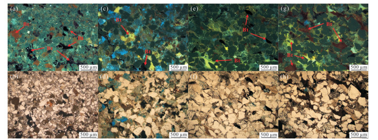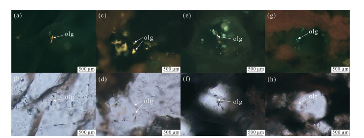 图 2 北大港潜山储层沥青镜下特征 a.GG16102井,1 982.72 m,二叠系,荧光×5;b. GG16102井,1 982.72 m,二叠系,透射光×5;c.GG1-1井,1 779.7 m,二叠系,荧光/透射光×5;d.GG1-1井,1 779.7 m,二叠系,透射光×5;e.GG2-1井,2 895.4 m,石炭系,荧光×5;f. GG2-1井,2 895.4 m,石炭系,透射光×5;g.GG2-1井,2 895.4 m,石炭系,荧光×5;h.GG2-1井,2 895.4 m,石炭系,透射光×5 Fig. 2. Bitumen fluorescence characteristics in Beidagang buried hill 图 6 北大港潜山流体包裹体镜下特征 a.GG16101井,2 856.83 m,奥陶系,荧光×50;b.GG16101井,2 856.83 m,奥陶系,透射光×50;c.GG1-1井,1 779.7 m,二叠系,荧光×50;d.GG1-1井,1 779.7 m,二叠系,透射光×50;e.GG10102井,1 982.72 m,二叠系,荧光×50;f.GG10102井,1 982.72 m,二叠系,透射光×50;g.GG10102井,1 981.42 m,二叠系,荧光×50;h.GG10102井,1 981.42 m,二叠系,透射光×50. olg为气液两相包裹体 Fig. 6. Microscopic characteristics of hydrocarbon fluid inclusions in Beidagang buried hill