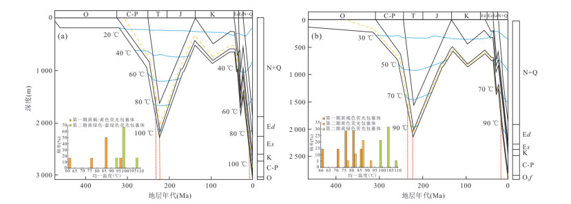 摘要: 渤海湾盆地潜山油气资源较丰富,近期黄骅坳陷古生界潜山油气勘探取得重大进展,但油气藏的形成时期及期次尚不明确.以黄骅坳陷北大港古生界潜山为例,综合利用储层沥青、流体包裹体观察、测温、拉曼光谱及红外光谱分析等地球化学分析手段,结合烃源岩生烃史,对其油气成藏期进行了系统研究.结果表明:研究区古生界发育碳质、胶质-沥青质、油质3种沥青,经历了生物降解和氧化作用等多种次生改造过程,结合研究区的构造演化及生烃史,推测早侏罗世中期之前存在油气充注;古生界潜山发育两期烃类包裹体,第一期包裹体发黄褐色荧光,主要分布于石英颗粒表面及方解石脉内,均一温度峰值区间为75~80℃,第二期包裹体包括黄色、蓝绿色荧光两类,分布在石英颗粒内裂缝、穿石英颗粒裂缝及方解石脉内,均一温度峰值范围分别为85~90℃和95~100℃;综合古生界潜山储层沥青及包裹体特征,结合烃源岩生烃史,确定古生界存在两期油气充注,分别为中三叠世(235~223 Ma)和新近纪-第四纪(22~0 Ma),且以晚期成藏为主.Abstract: The oil and gas resources of the buried hills in the Bohai Bay Basin are abundant. The oil and gas exploration in the Paleozoic buried hills in the Huanghua Depression has made significant progress recently,but the accumulation period of the oil and gas reservoirs is still unclear.The systematic study on the hydrocarbon accumulation period of the Paleozoic oil and gas reservoirs in the Beidagang buried hill is carried out using comprehensive utilization of reservoir solid bitumen analysis method,fluid inclusion analysis method and microscopic temperature measurement technology,in combination with Raman spectroscopy and infrared spectrum analysis and other geochemical analysis methods. The results show that the study area has three kinds of reservoir bitumen,including carbonaceous bitumen,colloid-asphaltene bitumen and oily bitumen,which have undergone various secondary transformation processes such as biodegradation and oxidation. It is confirmed that there is oil and gas charge before the middle Early Jurassic according to structural evolution of the study area.Two hydrocarbon inclusions are developed in the study area. The first stage of the inclusions shows yellow-brown fluorescence,which is mainly distributed on the surface of quartz particles and calcite veins. The homogenization temperature peak range is 75-80 ℃. The second phase inclusions show yellow and blue-green fluorescence,which are distributed in the fractures within the quartz grains,fractures through quartz grains and the calcite veins. The homogenization temperature peak ranges of the two are 85-90 ℃ and 95-100 ℃ respectively.Combining with the hydrocarbon generation history of source rocks,there are two stages of hydrocarbon accumulation in Paleozoic reservoirs,which are Middle Triassic (235-223 Ma) and Neogene-Quaternary (22-0 Ma),and the second period is the major stage.