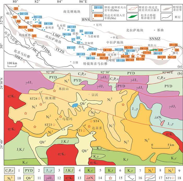 图 1 藏南拉萨地块后碰撞岩浆活动分布(a)和米拉山地区地质简图(b)