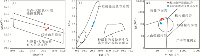a. Al2O3-SiO2,据Maniar et al. (1989);b. Th/Ce-Th,据Wang et al. (2006);c. Rb-Y+Nb,据Pearce et al. (1984)