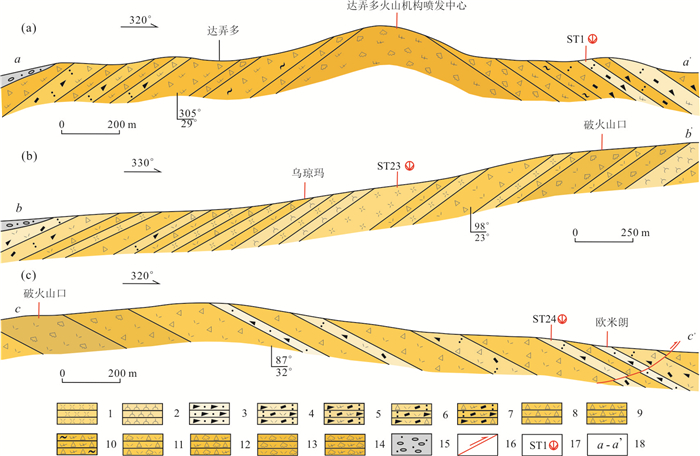 底图据刘栋(2017)修改;BNS.班公湖-怒江缝合带;SNMZ.狮泉河-纳木错蛇绿混杂岩带;LMF.洛巴堆-米拉山断裂;IYZS.雅鲁藏布江缝合带;STDS.藏南拆离系;MCT.主中央逆冲断裂;MBT.主边界逆冲断裂;1.晚石炭世-早二叠世松多岩组;2.二叠纪洋岛残片;3.早-中侏罗世叶巴组;4.晚侏罗世-早白垩世林布宗组;5.早白垩世楚木龙组;6.早白垩世塔克那组;7.晚白垩世设兴组;8.中新世地层第一旋回;9.中新世地层第二旋回;10.中新世地层第三旋回;11.全新世冲积物;12.早侏罗世花岗闪长岩;13.晚白垩世二长花岗岩;14.中新世花岗斑岩;15.火山机构;16.实测剖面;17.断层、不整合接触;18.采样位置