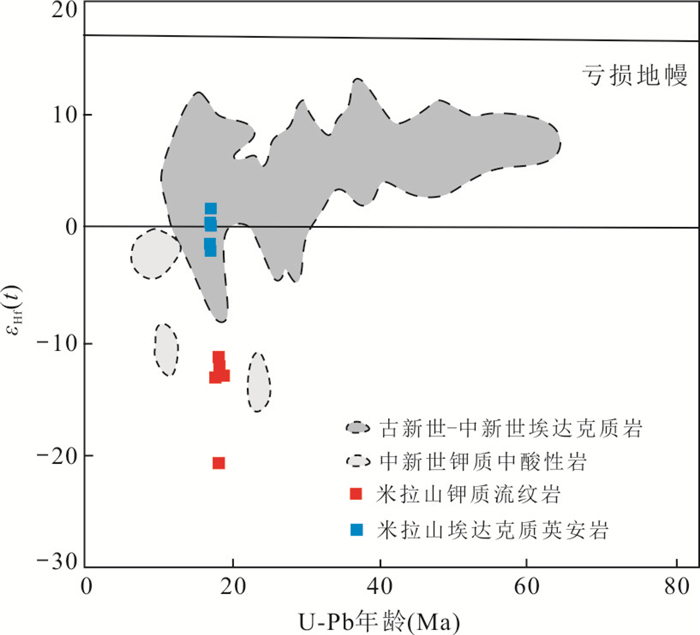 编号 年龄(Ma) 176Yb/177Hf 176Lu/177Hf 176Hf/177Hf ±σ εHf(0) εHf(t) ±σ TDM(Ma) TDMC(Ma) fLu/Hf ST4英安岩 3 17.0 0.038 935 0.001 741 0.282 767 0.000 018 -0.2 0.2 0.6 701 1 086 -0.95 6 17.0 0.038 912 0.001 737 0.282 718 0.000 019 -1.9 -1.6 0.7 773 1 198 -0.95 7 17.0 0.037 254 0.001 654 0.282 802 0.000 019 1.1 1.4 0.7 649 1 007 -0.95 8 17.0 0.035 398 0.001 584 0.282 770 0.000 021 -0.1 0.3 0.7 694 1 079 -0.95 11 17.0 0.046 933 0.002 039 0.282 707 0.000 021 -2.3 -1.9 0.8 794 1 221 -0.94 ST23流纹岩 1 19.0 0.025 391 0.001 125 0.282 391 0.000 018 -13.5 -13.1 0.6 1 222 1 929 -0.97 3 18.0 0.026 909 0.001 148 0.282 413 0.000 019 -12.7 -12.3 0.7 1 192 1 882 -0.97 4 18.0 0.025 146 0.001 152 0.282 434 0.000 019 -11.9 -11.6 0.7 1 161 1 833 -0.97 5 17.6 0.024 063 0.001 088 0.282 396 0.000 021 -13.3 -12.9 0.7 1 214 1 920 -0.97 7 18.0 0.020 022 0.000 798 0.282 180 0.000 017 -20.9 -20.5 0.6 1 504 2 399 -0.98 表 3 米拉山中新世火山岩主量元素(%)和微量元素(10-6)分析结果