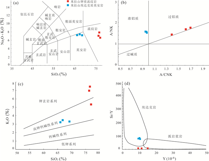 a. (Na2O+K2O)-SiO2图解,Middlemost(1994);b. A/NK-A/CNK图解;c. K2O-SiO2图解,Peccerillo and Taylor(1976);d. Sr/Y-Y图解,Defant and Drummond(1990)