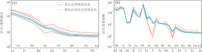 图 7 中新世火山岩稀土元素配分模式图(a)和微量元素蛛网图(b)