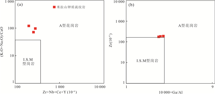 a. (K2O+Na2O)/CaO-Zr+Nb+Ce+Y;b. Zr-10 000×Ga/Al;据Whalen (1987)